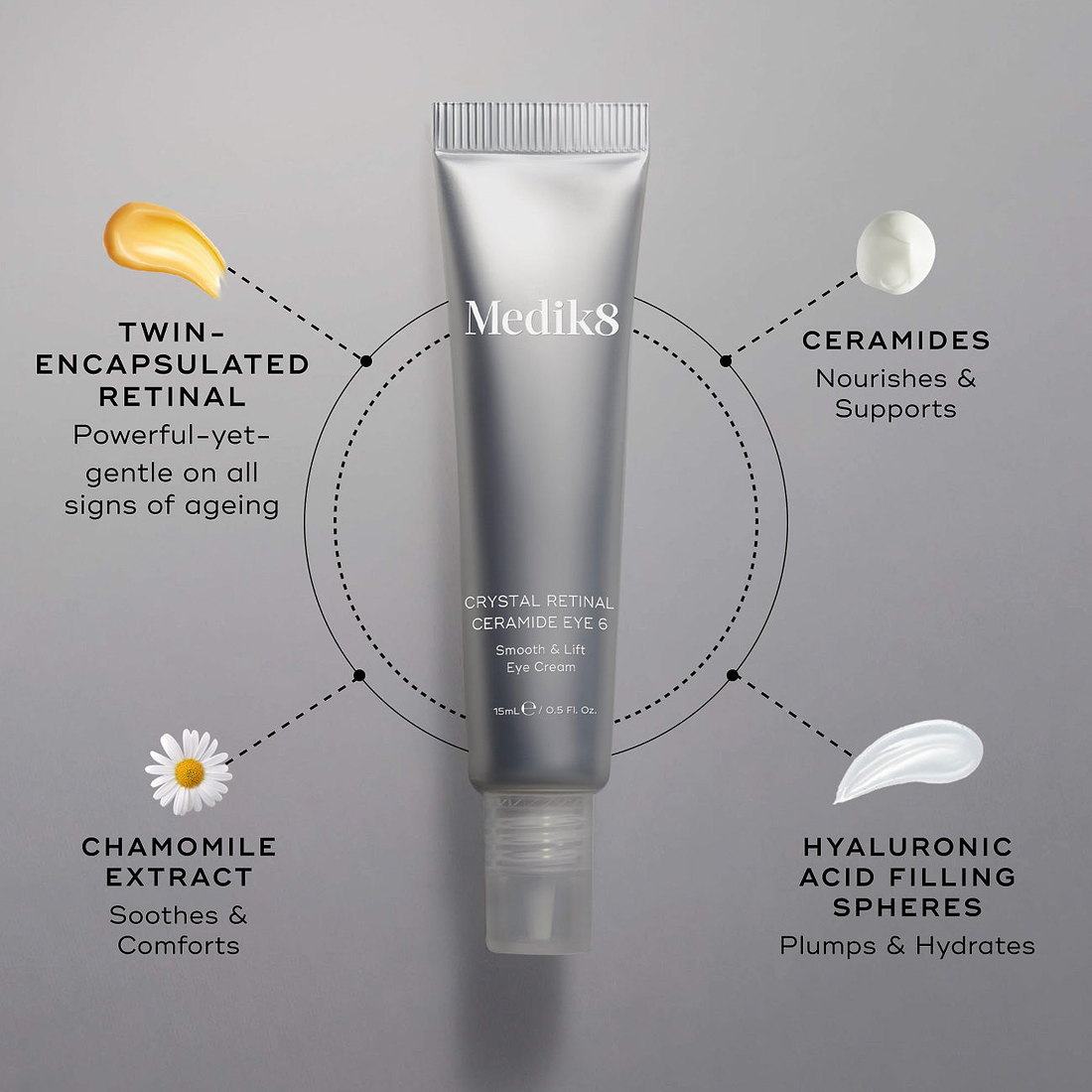 Medik8 has expertly stabilised retinaldehyde at a clinical strength, and combined it with ceramides and hyaluronic acid filling spheres to deliver nourishing care alongside age-defying results - optimised for the delicate eye area.