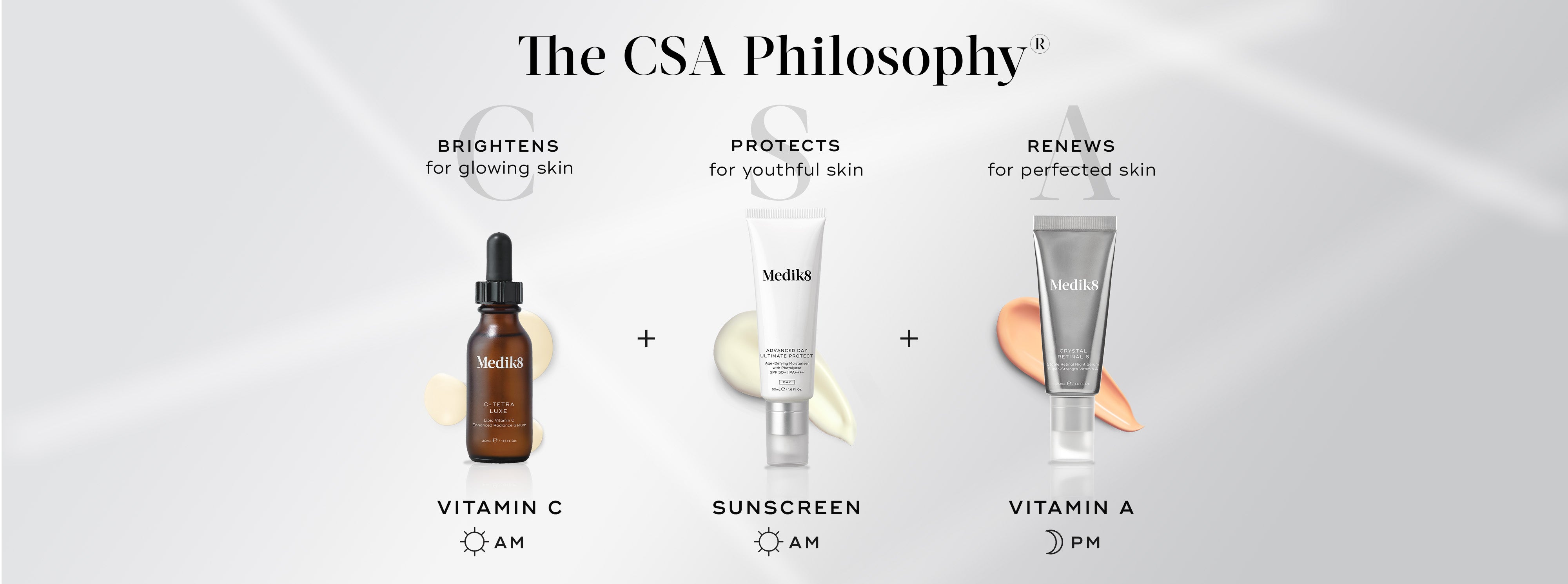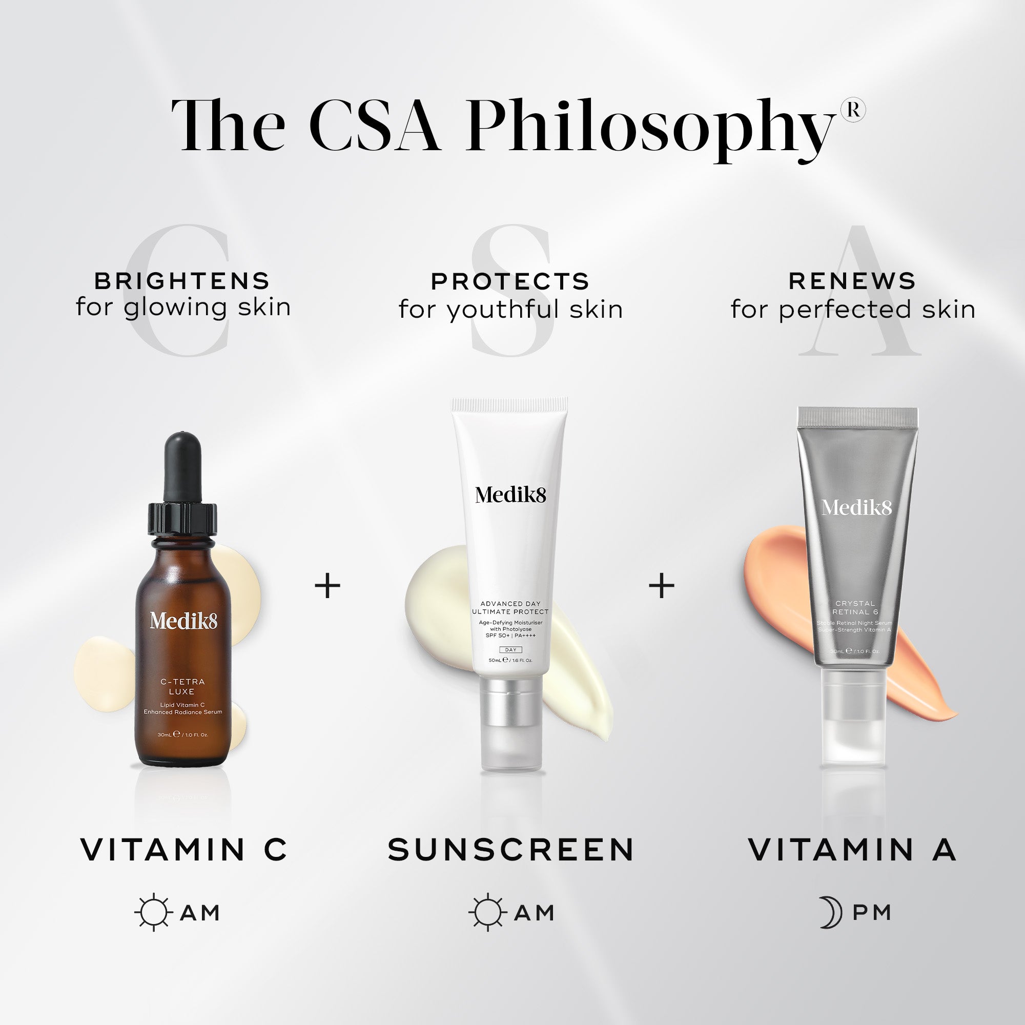 Enhance the visible youth-preserving benefits of sunscreen by pairing with vitamin C and vitamin A - as per Medik8’s pioneering CSA PhilosophyⓇ which recommends vitamin C plus sunscreen by day, vitamin A by night. Follow this simple, clinically proven approach for glowing, youthful-looking skin.